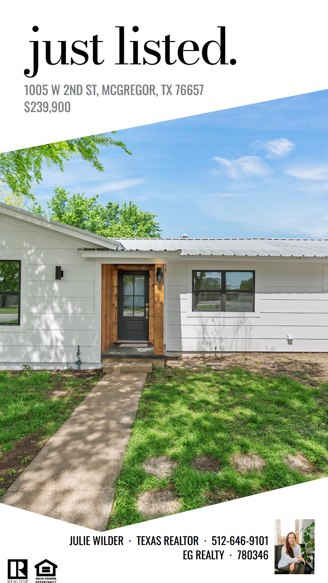 Welcome to your ideal home in McGregor. This perfectly maximized floorplan has 3 bedrooms, 2 full bathrooms, and elegant modern finishes. The bright owner's suite has two double-hung closets, with views of the spacious backyard, which includes a giant covered back porch that provides ample shelter from the summer sun while enjoying your expansive views of the open green areas beyond. Majestic mature trees are strategically placed for almost continuous shade around the property and home. With conveniences like a storage shed, and in-home laundry, and newly poured driveway and sidewalk, you can finally say you've found your perfect place in Central Texas! Come on home to 1005 W 2nd Street.